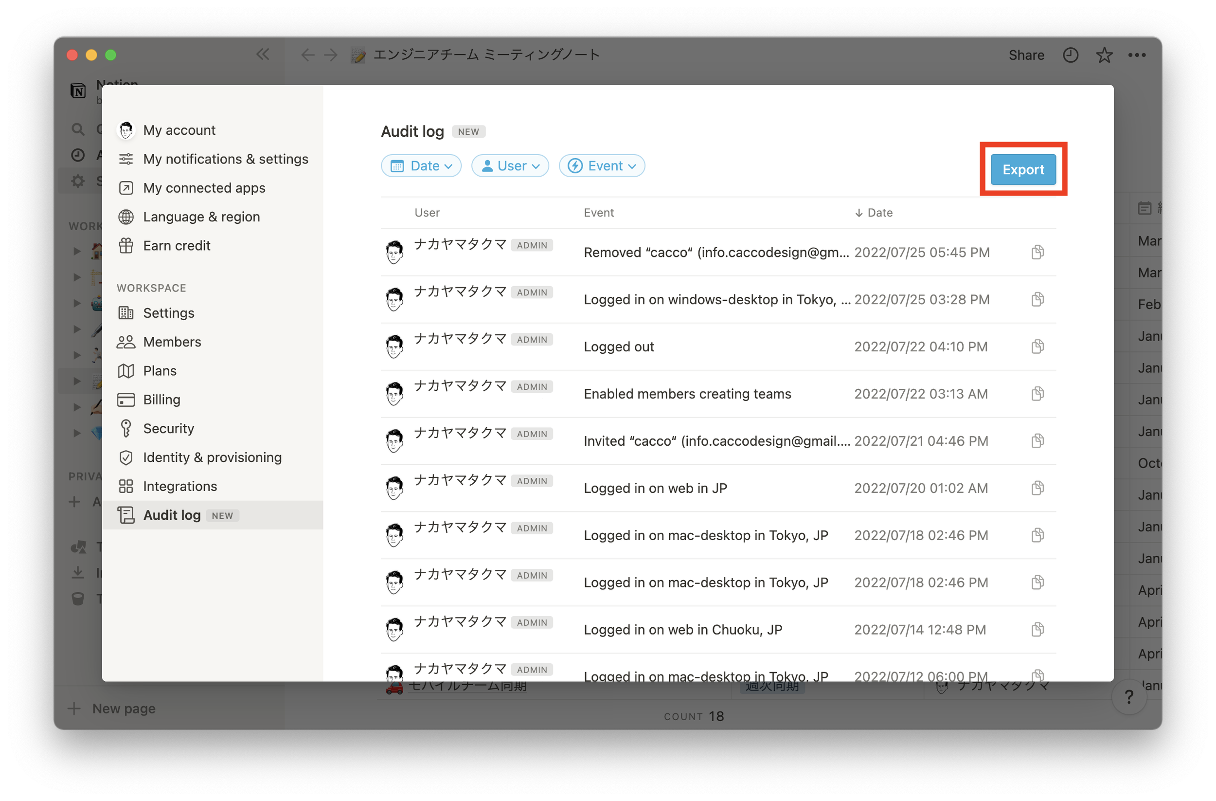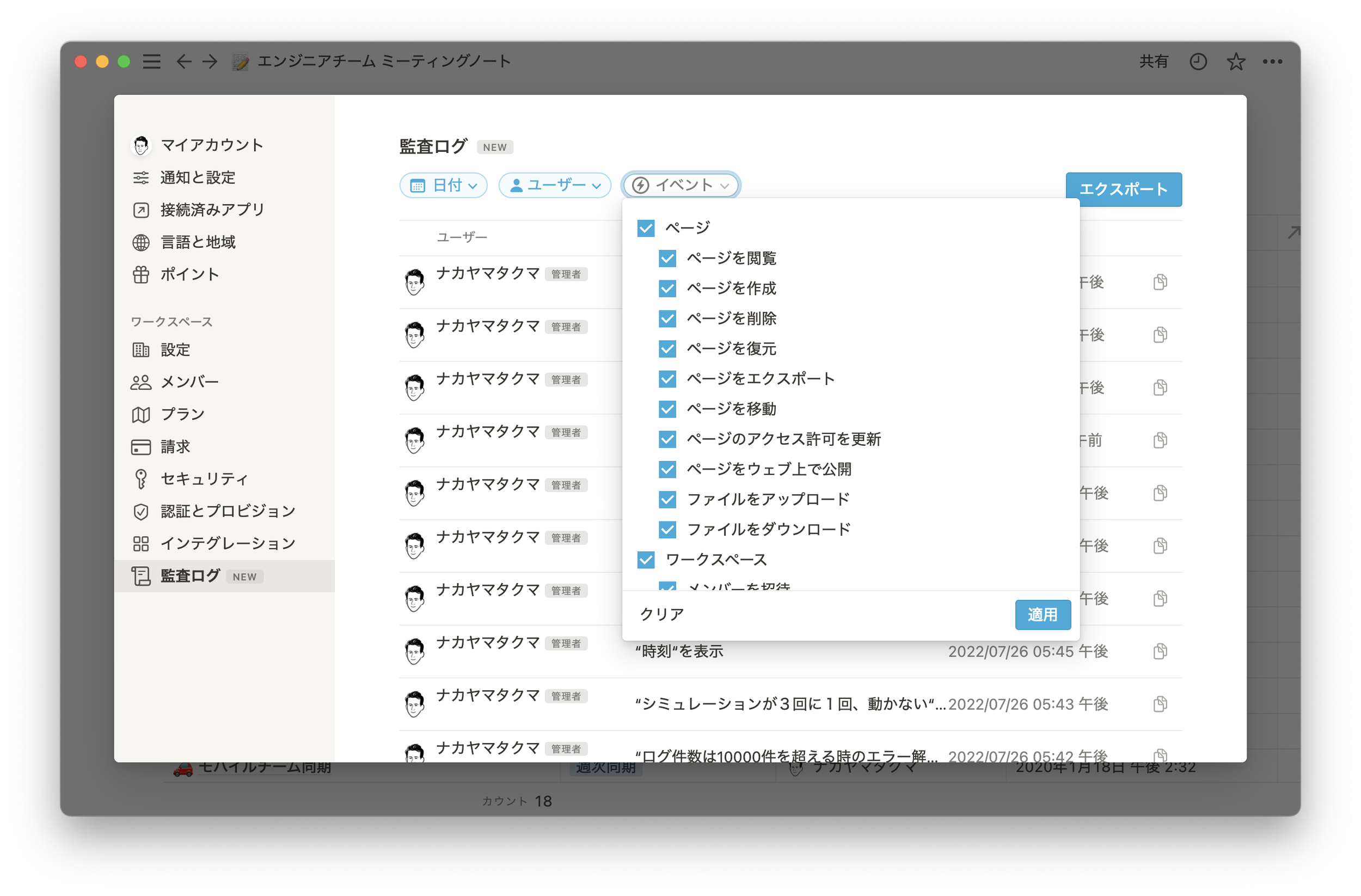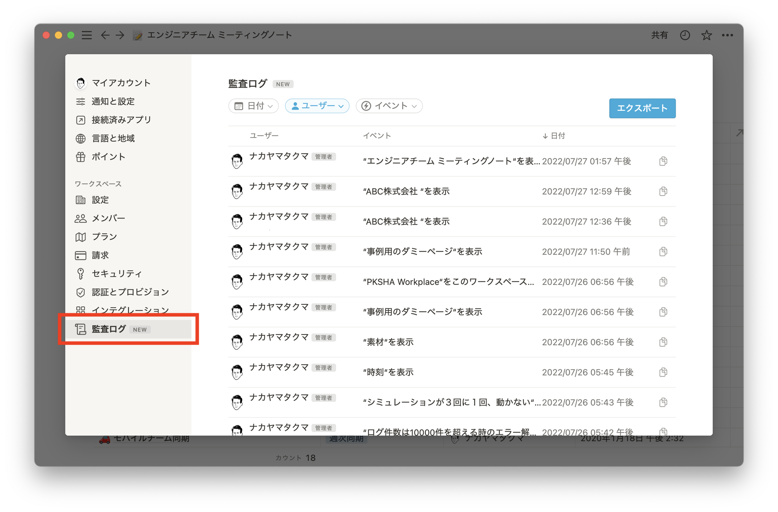Notion内のアクティビティや操作履歴を時系列で記録する機能です。不審な動きを監視することができ、トラブルシューティングに役立ちます。