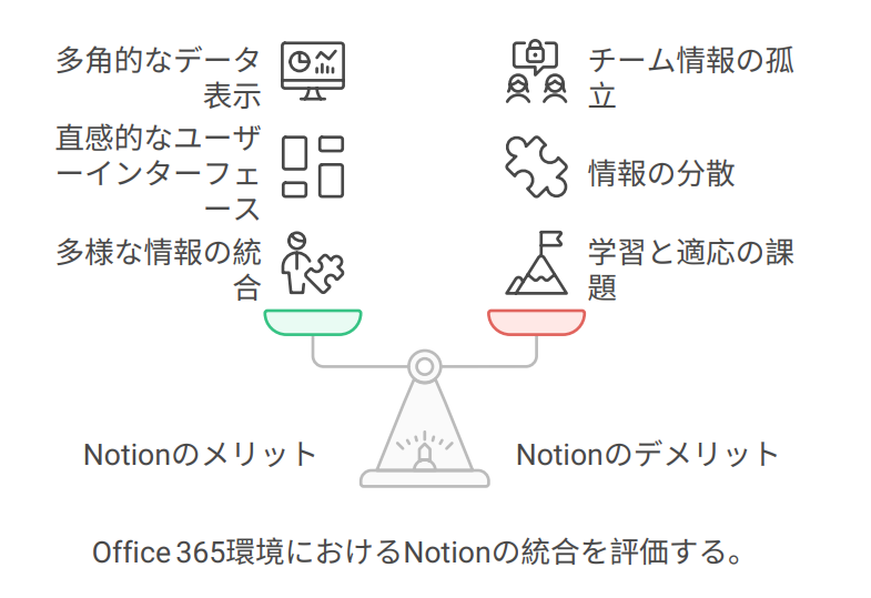 Office 365とNotionの両方を使用することで、情報がどちらのプラットフォームに存在するのか把握しづらくなる可能性があります。