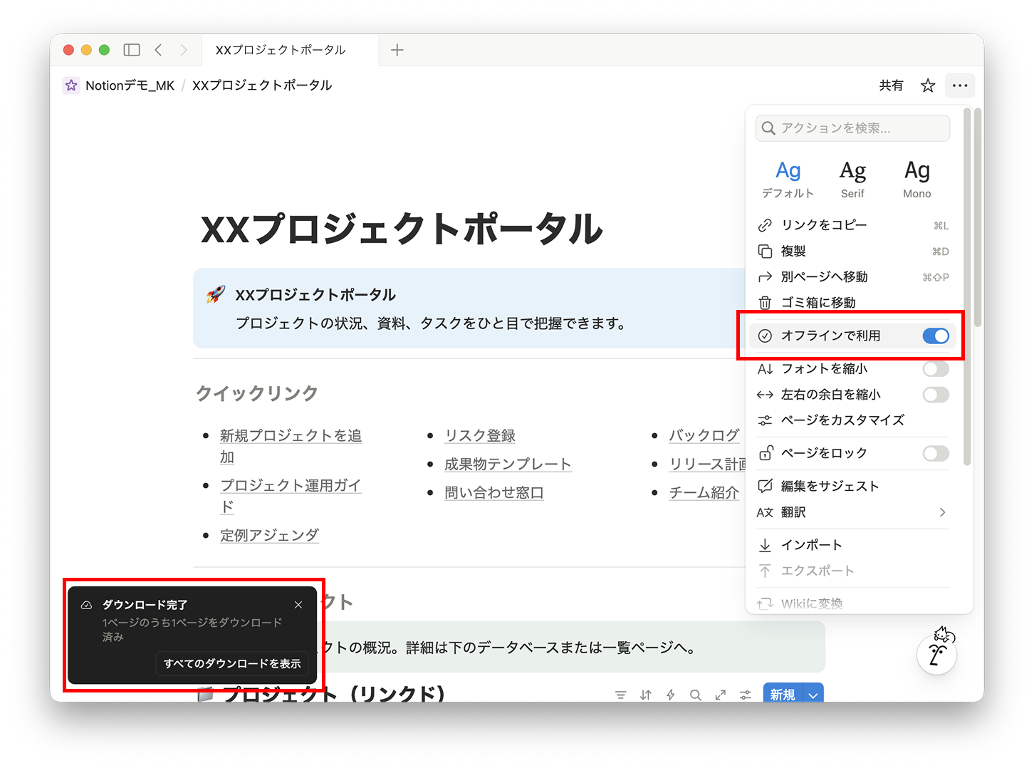 オンライン接続時に、Notionアプリでオフライン利用したいページを開く
