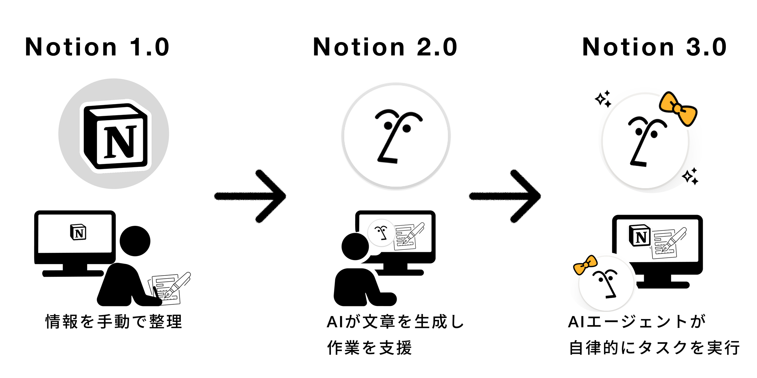 Notion 1.0では「情報を整理するためのノートツール」という印象が強く、続くNotion 2.0ではデータベースが登場しました。また、2.0の途中でAIアシスタントが搭載され「作業を補助するツール」へと進化しました。そしてNotion 3.0では、「補助」から「実行」へとできることが広がり、チームのワークフローそのものを最適化できるようになっています。