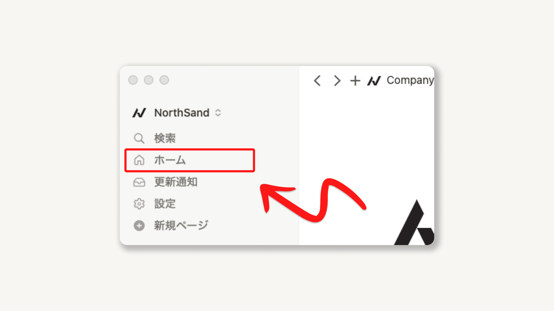 ホームは、Notionの左側にあるメニューバーからアクセスできます。