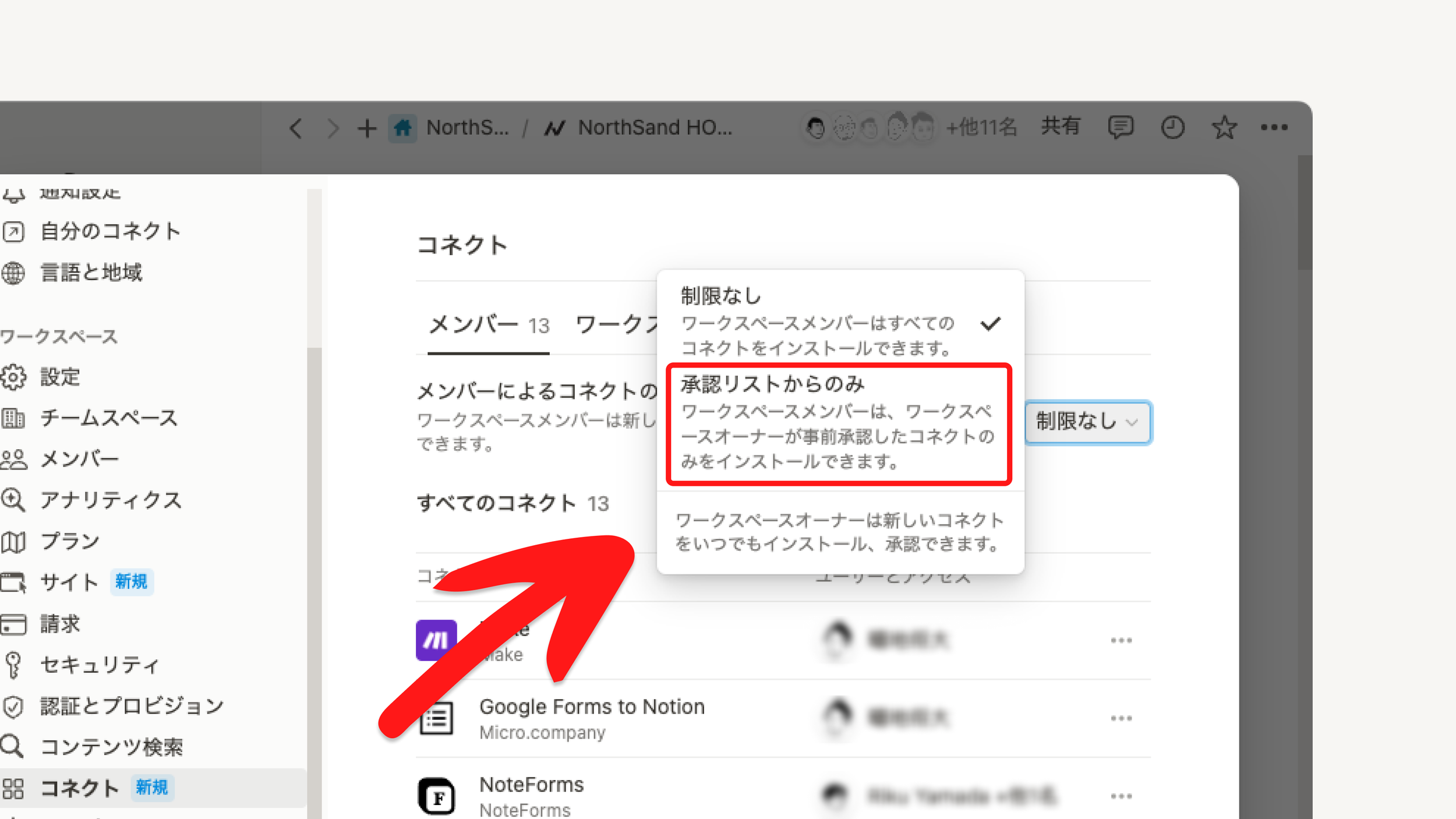 「メンバーによるコネクトの追加を制限する」のタブから「承認リストからのみ」を選択する