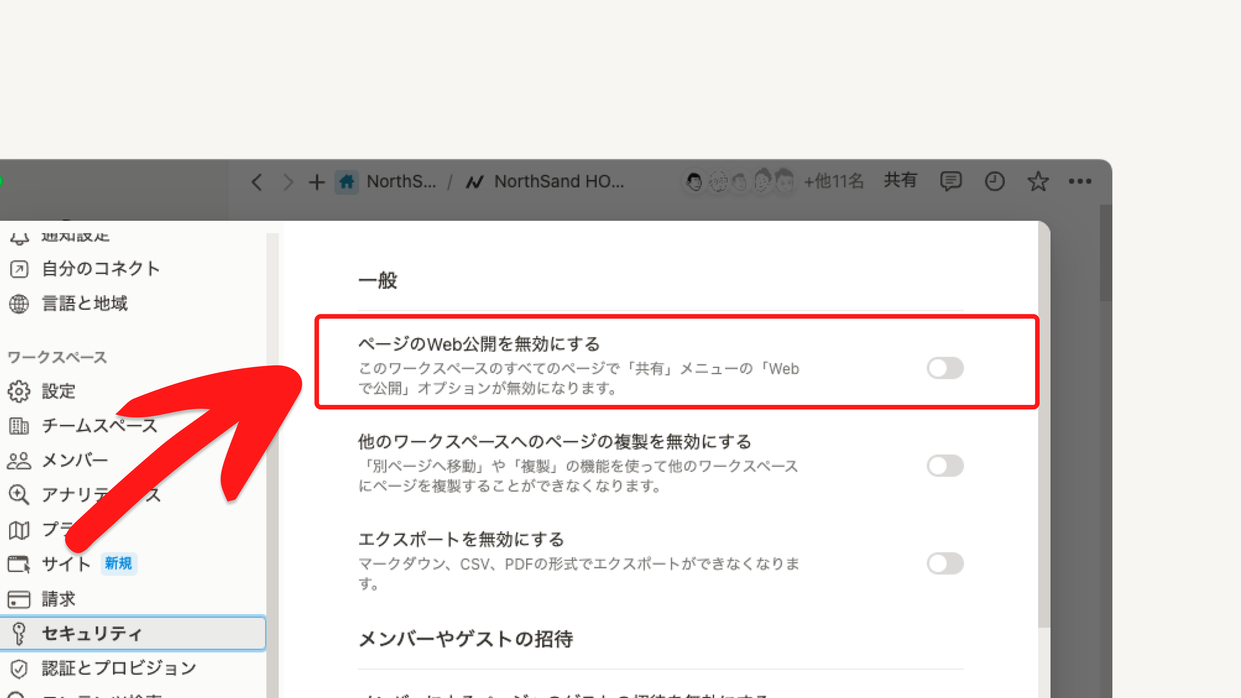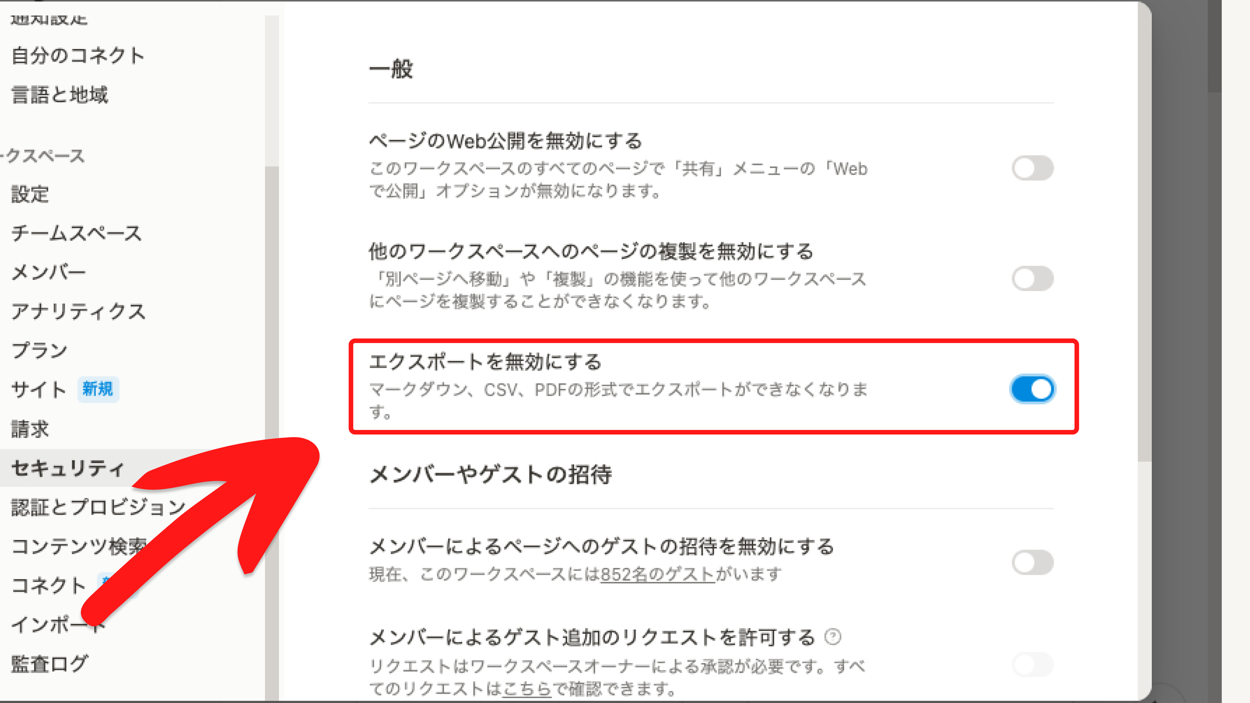 「メンバーによるページへのゲストの招待を無効にする」をオンにする