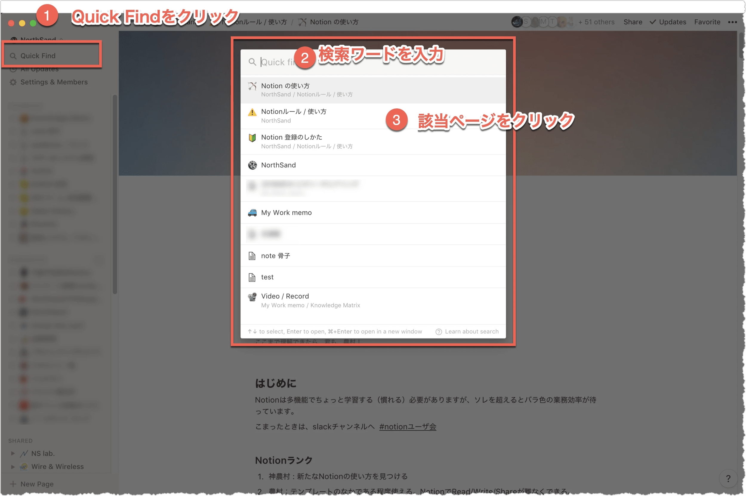 Notion で情報を探すには大きく二つの方法があります。 クリックがメインとなるWebサイトのように探す画面遷移か、Google検索のようなキーボードでの文字検索です。