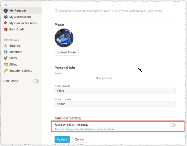 カレンダー表示の開始曜日を変更できます。この設定はワークスペース内すべてのカレンダーに適用されます。
